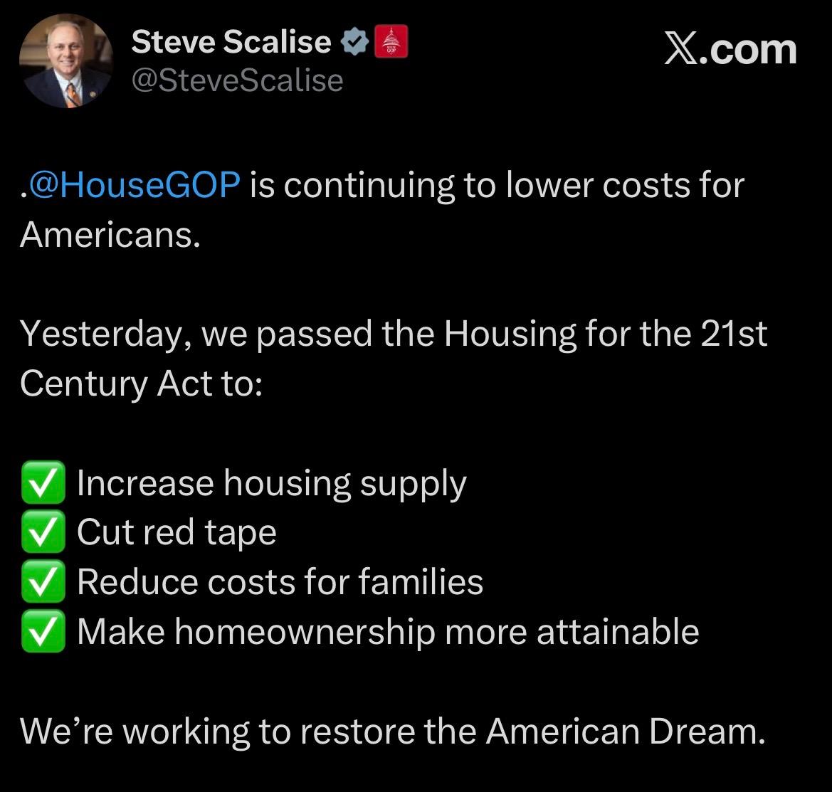 Yesterday, the House of Representatives passed the Committee’s bipartisan Housing for the 21st Century Act by a vote of 390-9. This bipartisan housing package addresses the housing shortage we face and the need to build more homes by cutting red tape, modernizing HUD, and unlocking financing to boost supply.