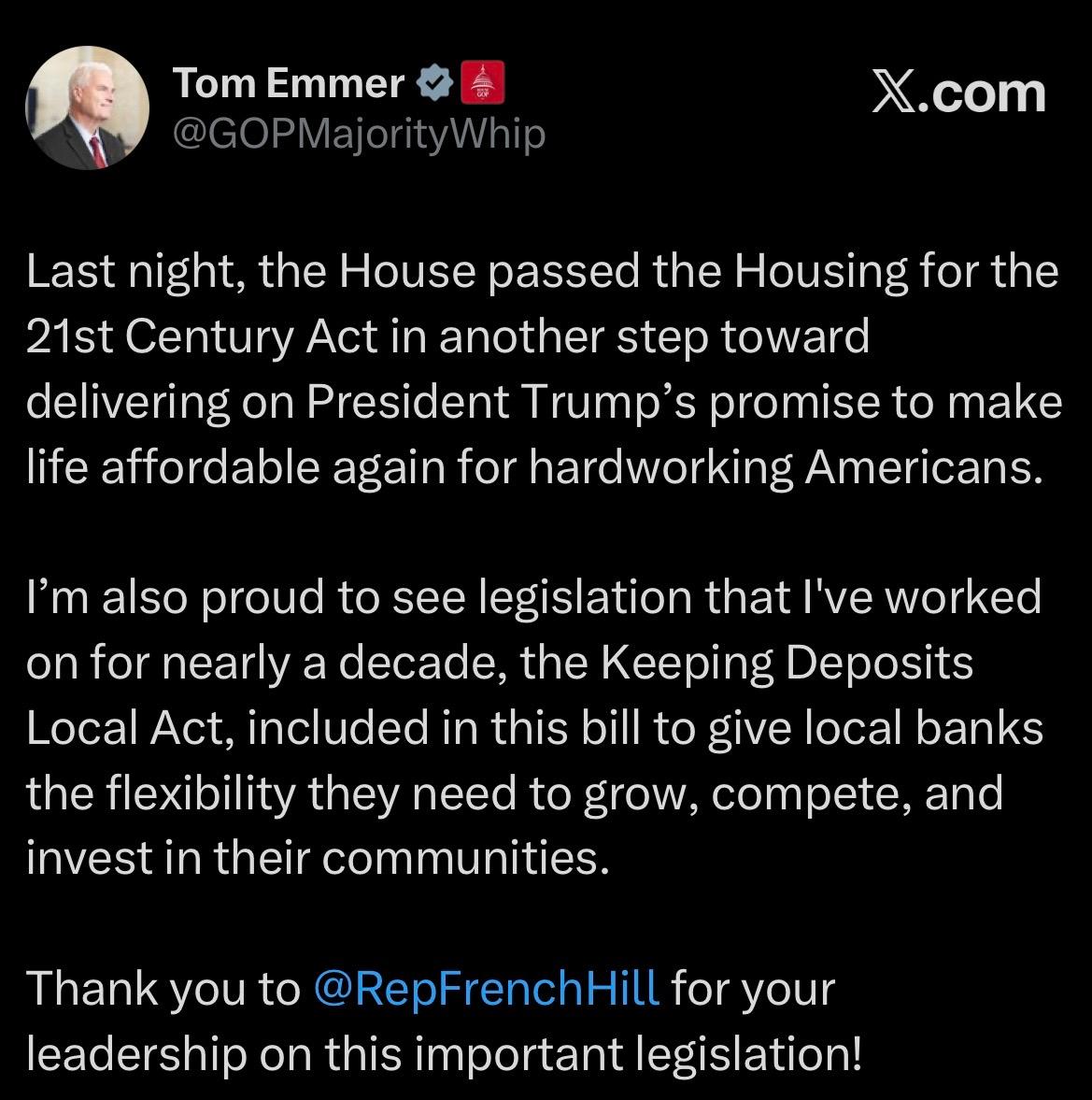 For more information on this bill, click HERE. Click here for the text of the bill. Click here for a one-pager. Click here for a section-by-section. Over 70 groups have endorsed the package. Members took to the House Floor to echo their support for the bill. Here is what they are saying: Chairman French Hill (AR-02) said, “… together, we have introduced the Housing for the 21st Century Act to deliver a straightforward approach to housing. Building more homes. Removing barriers standing in the way with an eye towards driving down that marginal cost of a new unit. Housing 21 will streamline approvals and simplify federal and local housing process to give rural and urban communities the tools they need to build homes faster. And importantly, our bill helps banks access stable deposit funding, streamlines the exam process that's tailored particularly for our vital community banks, and helps promote more community banks to do what they do best, lend locally and support their communities.” Subcommittee on Housing and Insurance Chairman Mike Flood (NE-01) said, “The Housing for the 21st Century Act cuts costs, slashes red tape, and will increase housing supply. There is no question the legislation before us is a historic rewriting of our housing laws to bring our housing market in to the 21st century.” Subcommittee on Financial Institutions Chairman Andy Barr (KY-06) said, “This bill cuts through the regulatory chokehold that Washington has imposed on housing. It streamlines permitting, modernizes outdated federal programs, and gets the federal government out of the way so builders can do what they do best — Build. It empowers local communities, not central planners in Washington, D.C. It supports community banks, and it focuses on supply side solutions, not failed subsidies that only drive prices higher.” Rep. Marlin Stutzman (IN-03) said, “House Republicans have heard these concerns and have responded with legislation that will directly help more Americans achieve the dream of homeownership. Instead of throwing more taxpayer dollars at ineffective government programs, we are restoring housing affordability by getting government out of the way. Included in this package are many common sense bipartisan reforms, and among them, my streamlined Rural Housing Act.” Rep. Monica De La Cruz (TX-15) said, “This legislation includes dozens of common-sense bipartisan housing solutions that meet the needs of the housing crisis everyday Americans are dealing with. I am particularly proud to see three provisions of mine included to update the FHAs mortgage insurances loan limits for residential multifamily constructions to bring more homes on the market, ensure veterans are made aware of the VA loan products there elidable for, and strengthen the coordination of the federal housing agencies to maximize the impact of our current federal housing programs.” Rep. Zach Nunn (IA-03) said, “This bipartisan legislation, led with my colleague Representative Cleaver, a democrat from Missouri, makes common-sense changes to fixing the housing programs that have been broken for far too long… This will help hundreds of thousands in Iowa and millions of Americans into homeownership and continued homeownership. Let’s restore the dream of homeownership for all of our country. It’s a win for everyone, its affordable, its achievable, let’s get it done.” Rep. Troy Downing (MT-02) said, “Americans across the country are feeling the squeeze of a very real housing crisis. The National Association of Realtors estimates that the average first time buyer was 40 years old in the year 2025. In my home state of Montana, the estimates show the median home price of a home exceeds $500,000. The internet and social media are filled with testimonies critiquing sky high housing prices and hotspots like Bozeman where starter homes can exceed $1 million.” Rep. Mike Haridopolos (FL-08) said, “Starting today we are moving in the right direction so that we might reduce those barriers to affordability and simply rely on the great economic message of increasing supply will reduce the costs.” Rep. Mike Kennedy (UT-03) said, “The American dream is getting more and more out of reach as housing costs continue to climb. While demand soars, the country remains stalled by a 5.5 million unit shortfall. Between the red tape or regulatory delays and the rigid constraints of zoning, the path to affordable living is being made more difficult to navigate, and it is American families who are paying the price. As one of the fastest growing states in the nation, this is a harsh reality for Utahns. We face one of the most expensive housing markets in the nation, and too many families are being priced out of the American dream. The truth is simple. When the government makes it slow, expensive, and unpredictable to build houses, the cost gets passed along to families. This bill attacks that problem by reducing regulatory costs and delays that make housing more expensive in the first place.” Rep. Jeff Crank (CO-05) said, “In my home state of Colorado, regulations account for 39% of the cost of building a new home. 39% of the cost is government imposed regulation. For those who might be wondering what that means, that's if you pay $5, $2 of that is just because of regulation. That's what's causing the problem. Government should exist to provide order and protection for its citizens. It shouldn't be there with overbearing mandates that make life more difficult and expensive, especially for something as fundamental as property and home ownership.”